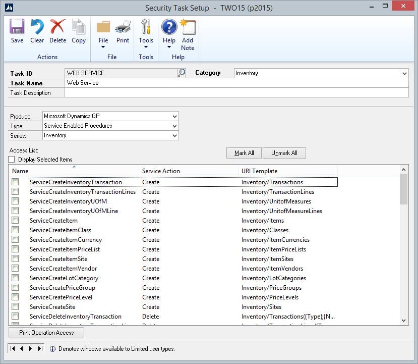 Finally, a lot more detail for the methods that are available can be found at https://mymachine:myport/GPService/Tenants(Test)/Companies(CompanyName)/Help. This has all of the methods by product and some information about the call and response.